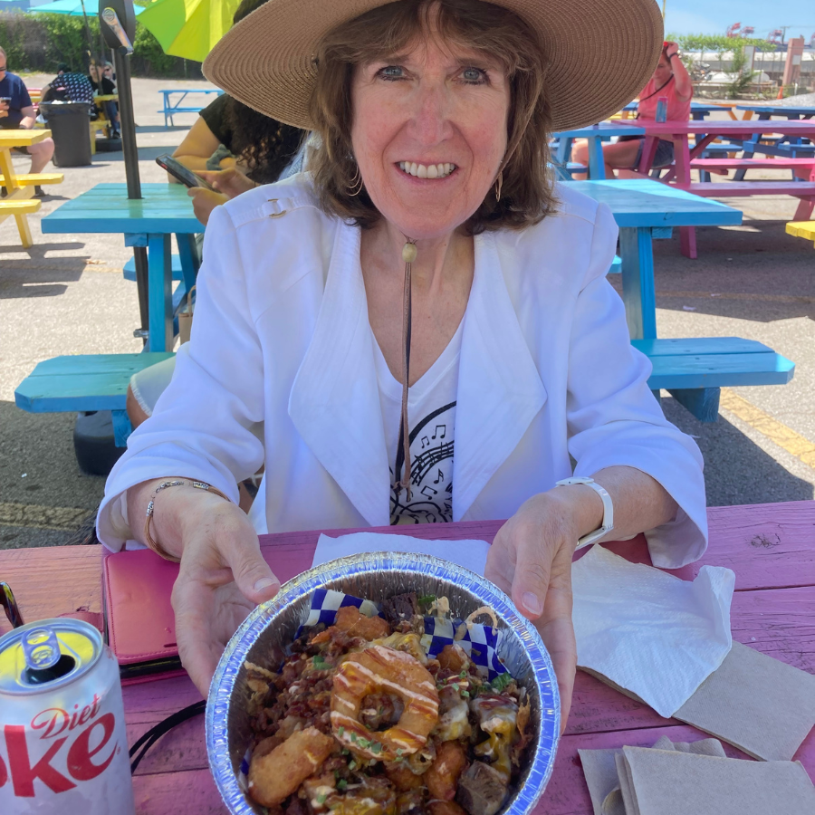 Built like a cathedral on an aluminum pan… they lined the bottom layer with fried cauliflower (or French fries but we chose the “healthier” cauliflower option) followed by a deluge of brisket, onions, cheese, spices, and topped off with an onion ring. The counter woman asked what name should she call out when the order was ready.